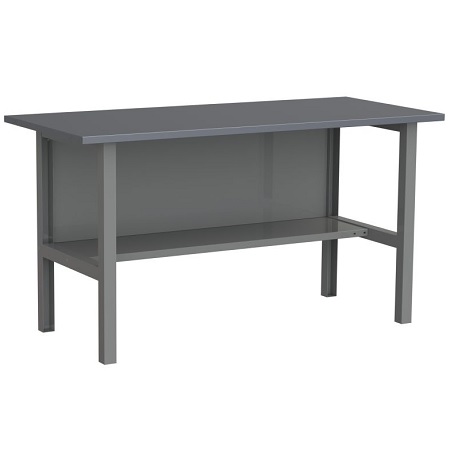 Верстак комплектуется полкой-стенкой, расположенной под столешницей для удобного размещения габаритного инструмента и оснастки. Опорные элементы выполнены сварными из холоднокатаной стали. Все металлические элементы покрыты полиэфирной порошковой краской. Столешница из фанеры толщиной 24 мм, которая покрыта листом оцинкованной стали толщиной 1,2 мм. Глубина столешниц 696 мм. Максимальная масса груза на столешнице - 350 кг.