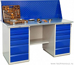 Двухтумбовый. Допустимая нагрузка на столешницу 1000 кг. Опорные элементы выполнены сварными из холоднокатаной стали. Для выполнения сборочных, ремонтных, слесарных, монтажных и других видов работ на производстве, в сервисных центрах, мастерских, гаражах, а также для обучения технологии в учебных заведениях. Комплектуется полкой-стенкой, расположенной под столешницей для удобного размещения габаритного инструмента и оснастки. Размеры верстака: 855x1596x696 мм. Вес: 128 кг. Поставляется в 4 комплектациях на выбор.