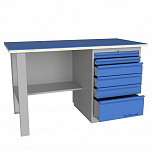 Верстак однотумбовый поставляется в разобранном виде. Нагрузка на столешницу до 600 кг. Стандартный цвет: корпус - серый глянец RAL 7030, ящики и двери тумб - синий RAL 5017. Размеры:855x1600x700 мм. Вес: 86 кг.