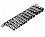 Головки изготовлены из закаленной хром-ванадиевой стали. Полированная поверхность. В набор входит планка крепления и хранения головок.Набор 9 предметов (Е10, Е11, Е12, Е14, Е14, Е16, Е18, Е20, Е22, Е24).
