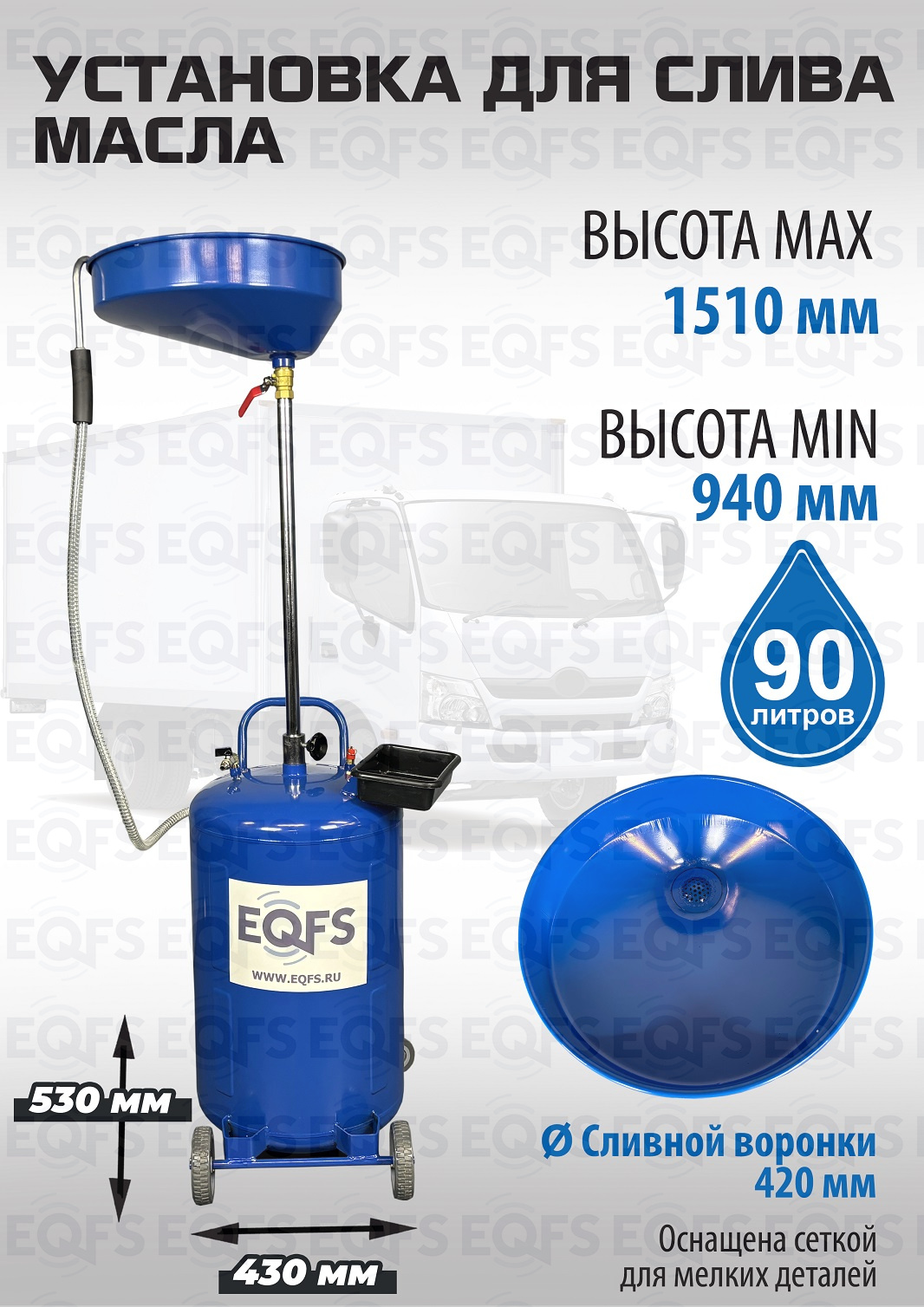 Установка для слива «отработки» самотёком масла и антифриза из любых транспортных средств. 80л.+10л. приёмная воронка. Регулировка высоты воронки 940-1510мм. Визуальный контроль уровня заполняемости бака. Слив собранной в баке «отработки» самотёком или под давлением. Лоток для сливной пробки/инструмента.