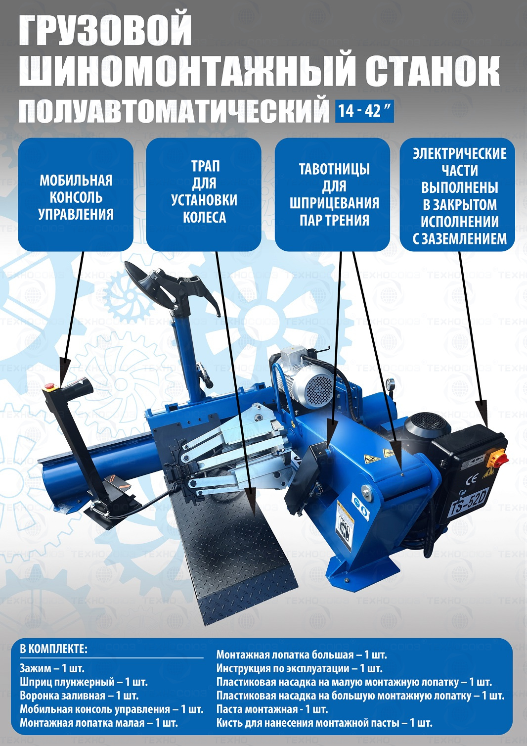 Комплект из TS-52D грузового шиномонтажного станка для дисков 14”-42”, очень качественный станок. За последние 9 лет ни одной рекламации!!!  Диски сталь + ALU Ø 14÷42” с адаптерами 14÷52”(опция). Максимальное колесо Ø2300 ширина 1050мм, вес до 1600кг. Моторы 2,2 + 2,2 кВт, 380В. Гарантия 12÷18мес. Гидронасос «BUCHER HIDRAULICS». Cтанок подходит для тракторов, сельхозтехники, еврофур и т.п.