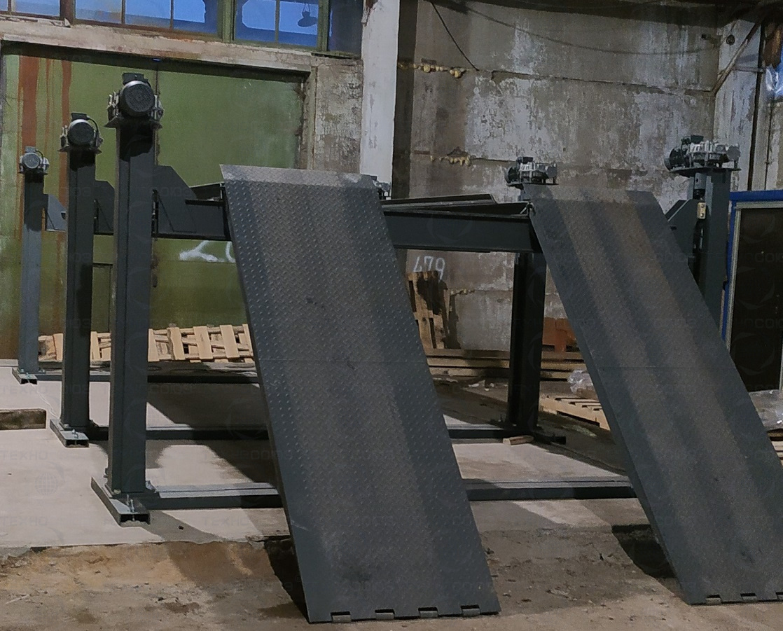 Подъемник состоит из шести стоек 1, 2, 3, 4, 5, 6 (см. Рис.), каждая из которых имеет электромеханический привод, состоящий из электродвигателя и червячного редуктора, грузовой винт, рабочую и страхующую гайки, конечные выключатели верхнего и нижнего положений балок. Стойки попарно соединены поперечными балками лежащими на опорных шайбах рабочих гаек. На поперечных балках установлены платформы фиксируемые в зависимости от колеи автомобиля. На стойке 1 установлен шкаф аппаратный, с панелью электрооборудования, лампочками «Сеть» и «Аварийное отключение», кнопками управления «Вверх» и «Вниз» и с автоматическим выключателем. Стойки подъемника крепятся на раме, состоящей из трех оснований. Рама в зависимости от пожелания заказчика может быть забетонирована в пол, либо установлена на поверхности пола с возвышением над уровнем пола на 74 мм.