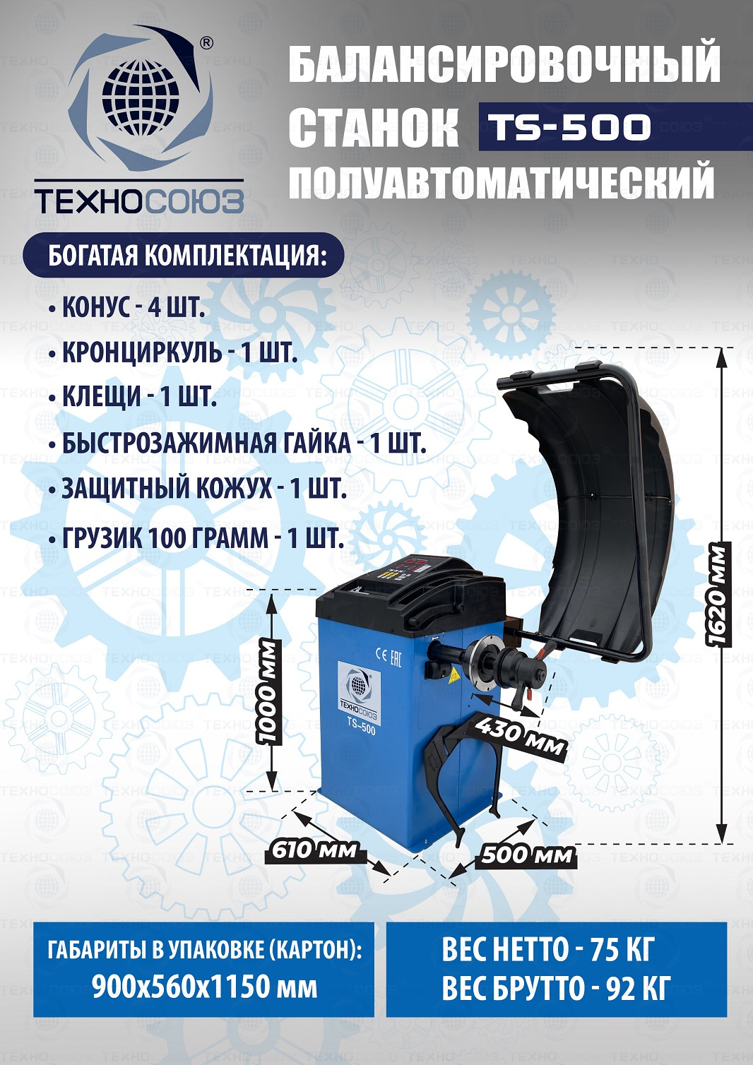 + Балансировочный станок TS-500. Полуавтоматический. Лазерная указка места установки грузика. Режимы работы: STANDART, STATIC, ALU1, ALU2, ALU3. Автокалибровка. Режим оптимизация дисбаланса. Режим MOTO. Автозапуск при опускании кожуха. Для легковых авто и «Газелей» с диаметром диска с резиной до 760 мм, диаметр диска 10–24” (256-610 мм). Гарантия 12 мес.