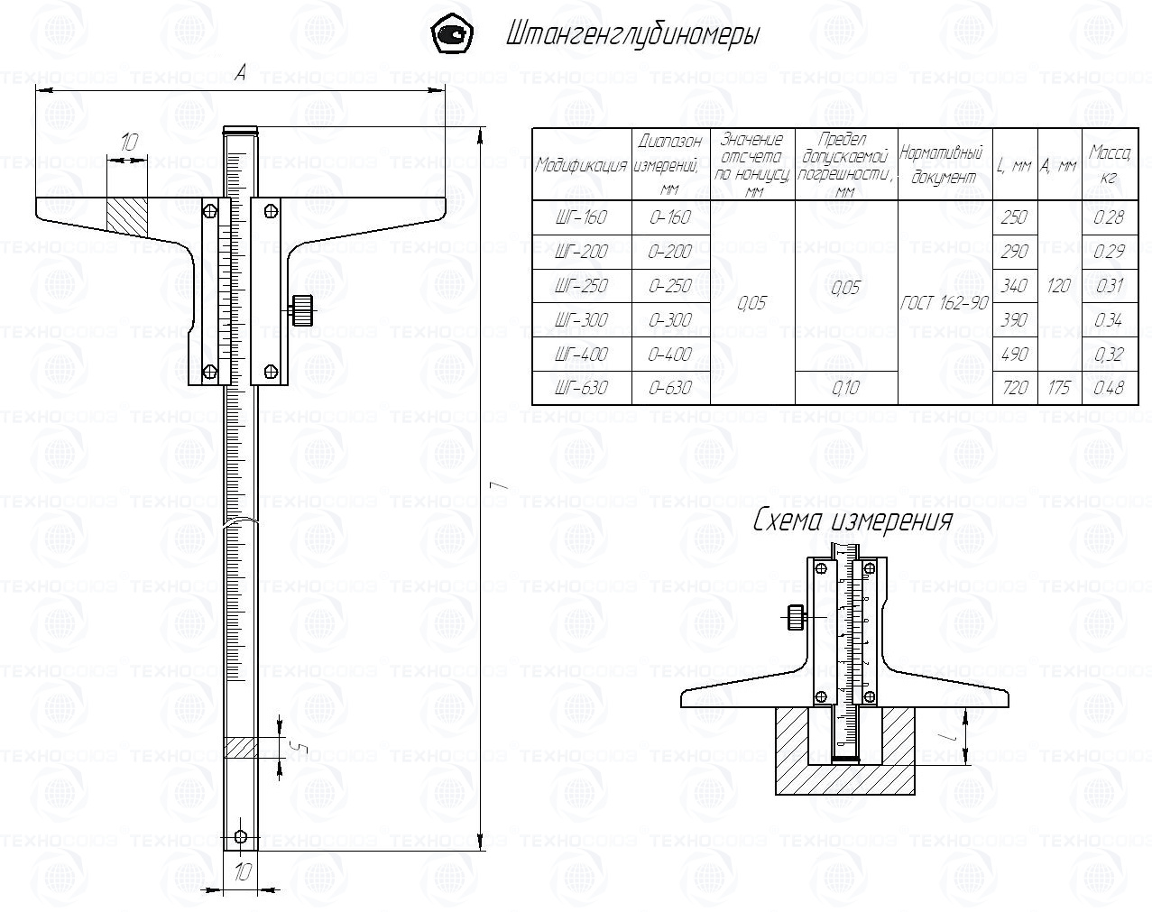 Пример условного обозначения штангенглубиномера с диапазоном измерения от 0 до 160 мм и значением отсчета по нониусу 0,05 мм - Штангенглубиномер ШГ-160-0,05 ГОСТ 162-90.